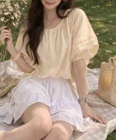 ラウンドネックベーシックパフスリーブ半袖無地ブラウス・B1956036