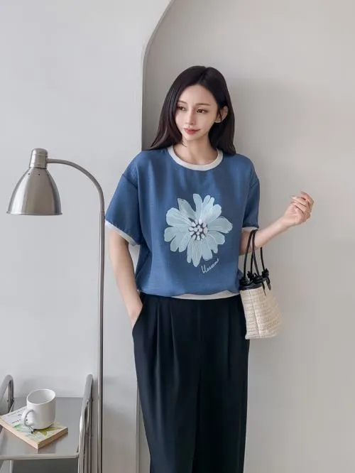 ラウンドネックパフスリーブ半袖ドロップショルダープリント配色ラインブラウス・B1965156