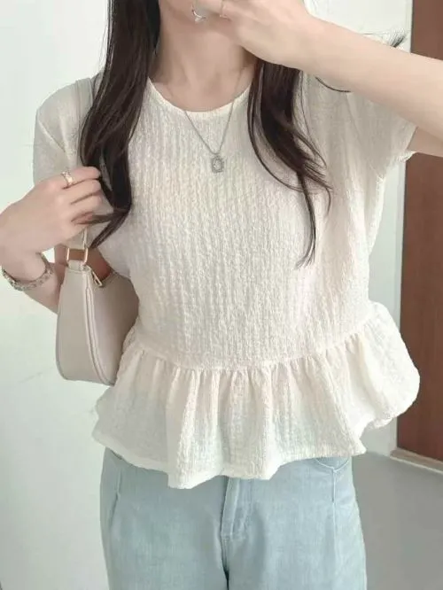 ラウンドネックフリルパフスリーブ半袖ギャザーバックリボンブラウス・B1967122