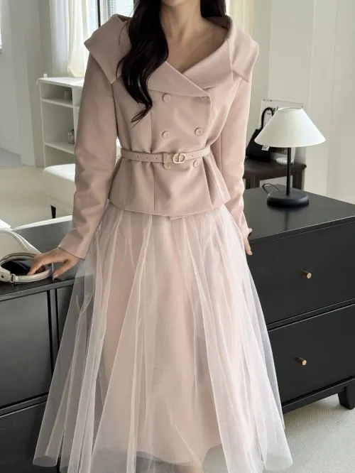 Vネック肩パッドラインショート長袖ワイドネックダブルボタン無地ダブルジャケットベルト付・B1961936