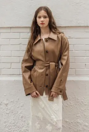 レザー調ボタンカラーポケットボクシールーズ長袖ジャンパーベルト付・S1966180