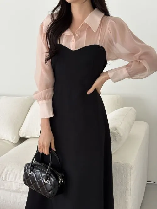 シアーコントラストパフマーメイドワンピース・t66900