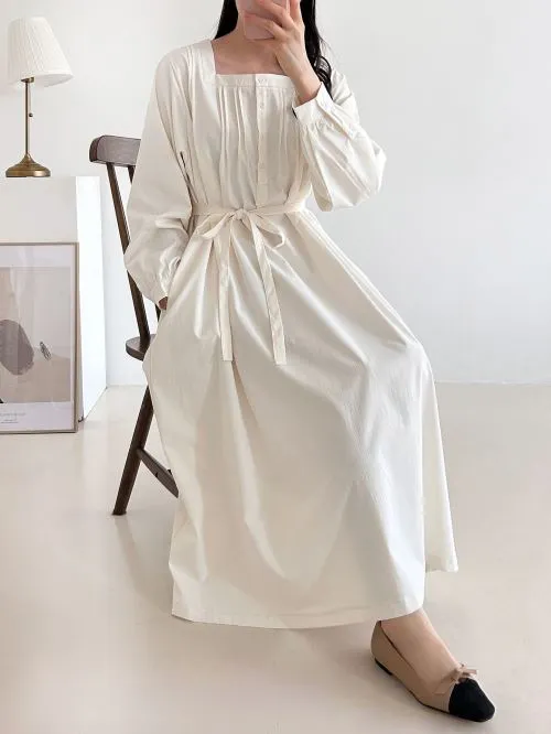 コットンラウンドネックスリットベーシック長袖ミディワンピース・B1960276