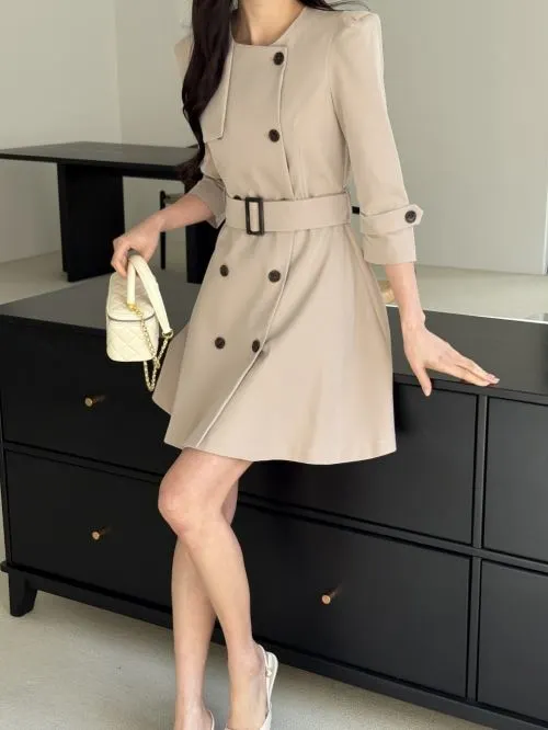 ラウンドネック7分袖Aラインミニダブルボタンワンピースベルト付・B1962289