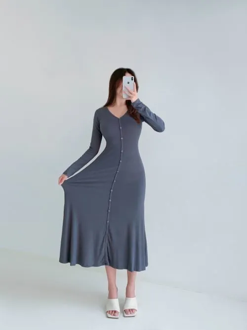 VネックボタンリブAラインワンピース・B005511