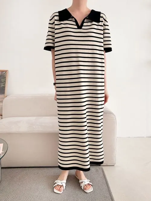 スリットオープンカラーオーバーサイズマキシルーズ半袖Hライン(ロング丈)ボーダー配色ワンピース・B1963692