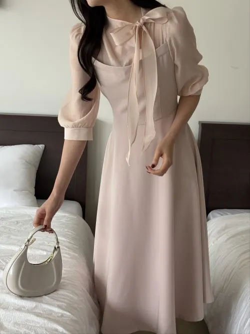 コンビボウタイパフスリーブロング7分袖フレアAライン無地ワンピース・B1963750