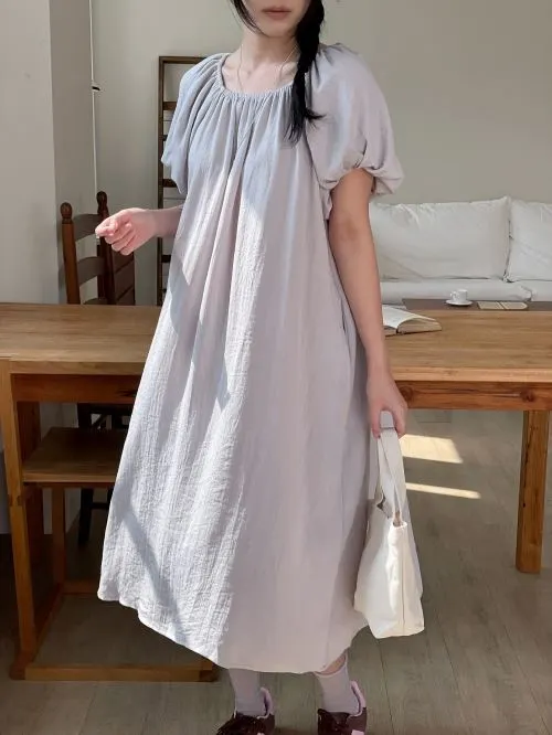 ラウンドネックシャーリングパフスリーブレイヤード風ロング長袖フレアAライン無地ワンピース・B1961263