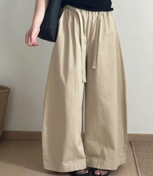 コットンドローストリングポケットウエストゴムドローコードロングストレートワイド配色パンツ・B1960681