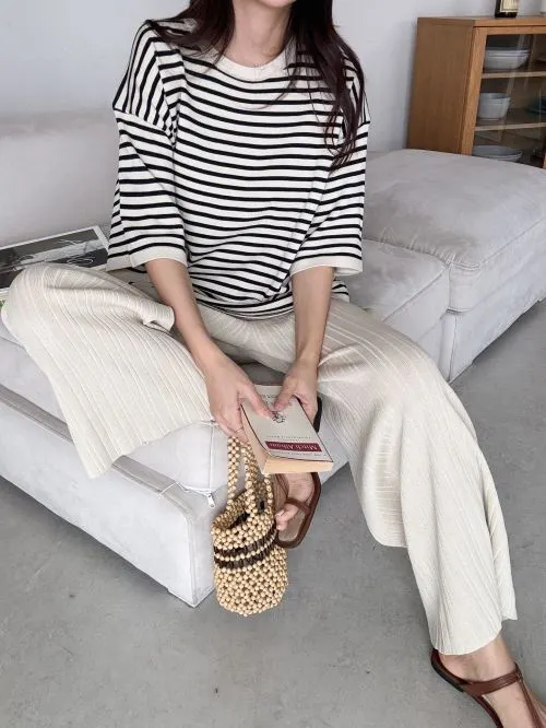 ラウンドネックウエストゴム半袖ボーダーセットアップパンツニット・B1965369