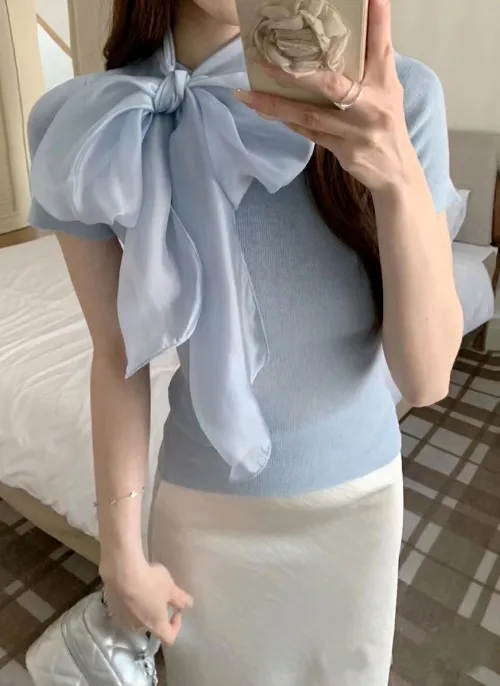 オーガンジーウール混スリム半袖スカーフネックニット・B1962675