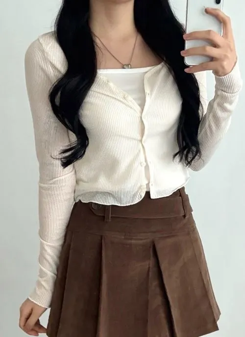 リブシースルーボタンラウンドネッククロップドスリム長袖ペンダント無地カーディガン・S1960443