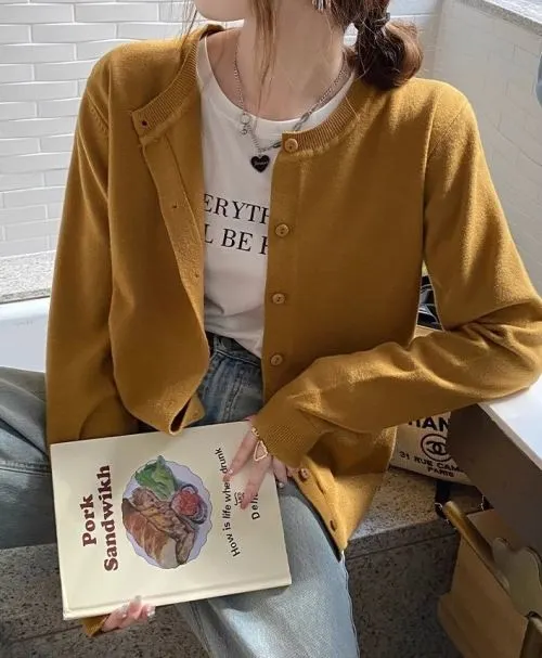 ウール混セミクロップドボタンラウンドネックベーシックカラーカーディガン・S1942878