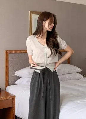 リネン混パフ半袖Vネックカーディガン・p680061