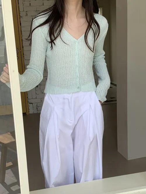 Vネッククロップドシアーリブニットカーディガン・B000377