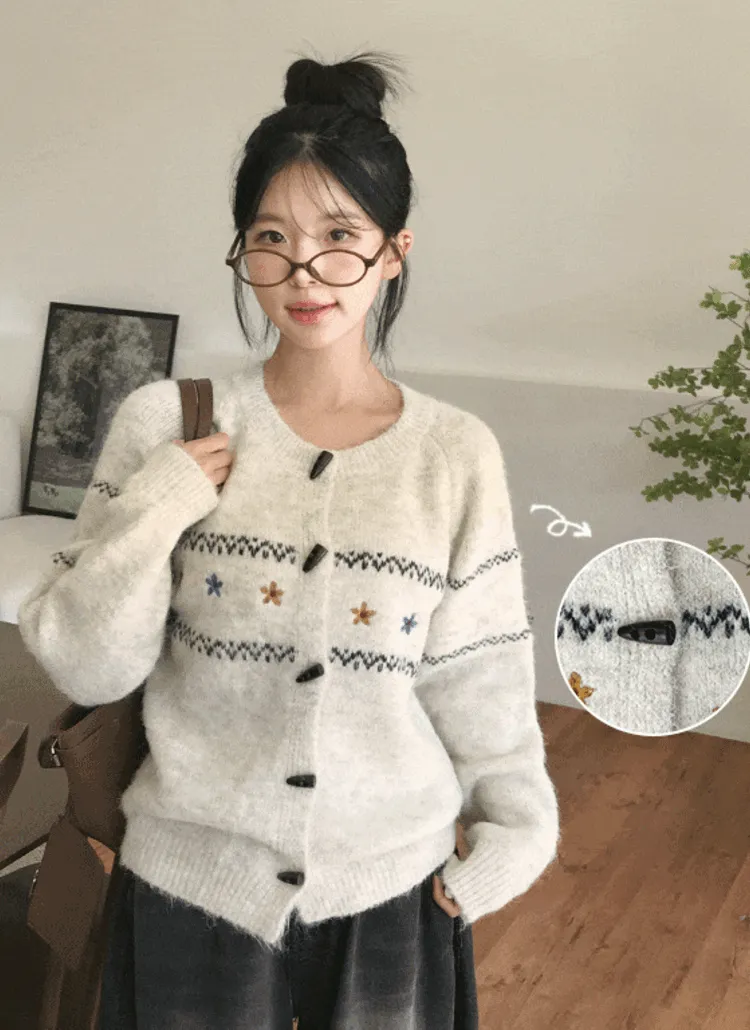 トグルボタンラウンドネック花柄刺繍ノルディックカーディガン・S1936792