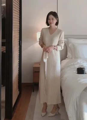 ストラップ付Vネックリブニットロングワンピース・p698134