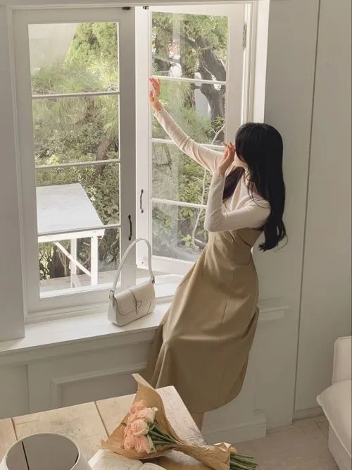 ストラップ付ギャザーUネックパフワンピース・B021080