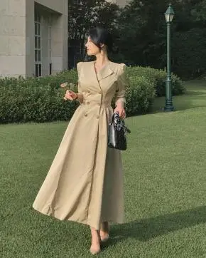 カラーパフスリーブダブルボタンAラインロング長袖ワンピース・S1938317