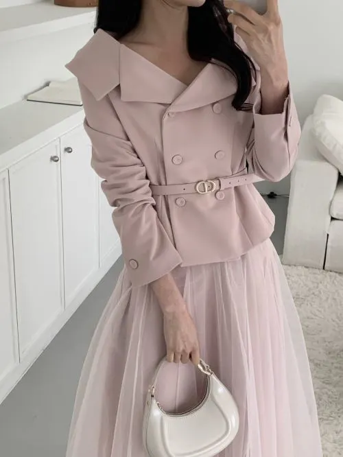 レースチュールコンビVネック肩パッドラインショートロング長袖フレアAラインワイドネックダブルボタン無地ツーピース(トップス、ボトムス)スカートダブルジャケットベルト付・B1961901