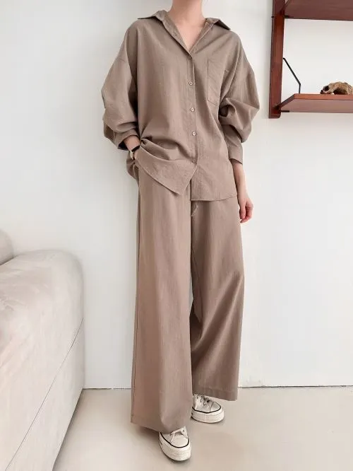 カラードローストリングウエストゴムオーバーサイズロングルーズワンポケットストレートワイドボタンスリーブドロップショルダー無地パンツ・B1960032