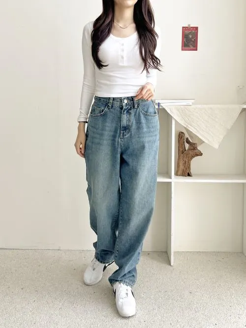 3TYPEステッチボタンヘムノンウォッシュワイドデニムパンツ・p680157