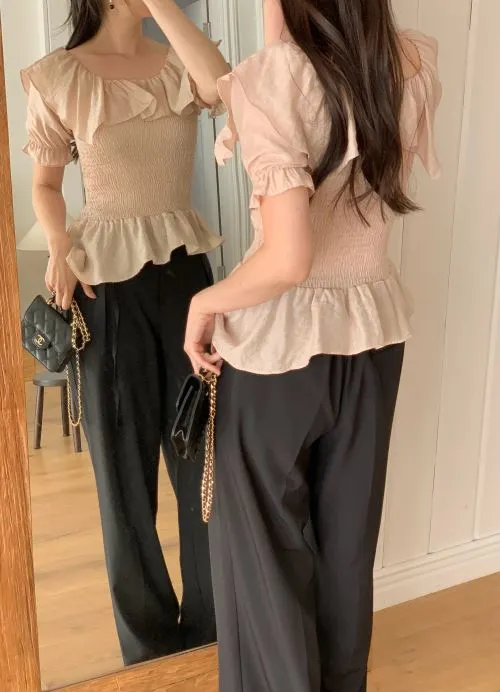 オフショルダーシャーリングパフスリーブスリムアンバランス半袖ブラウス・B1963231