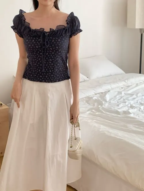 ストラップオフショルダーシャーリングフリルパフスリーブスリム半袖セミクロップド小花柄ブラウス・B1963232
