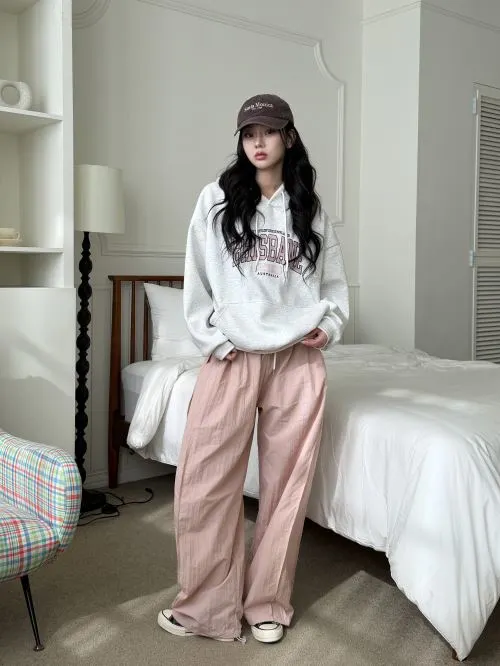 コットンドローストリングポケットウエストゴムドローコードロングストレートワイド配色パンツ