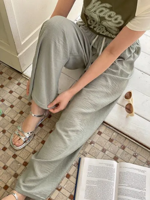 リネン混シャーリングドローストリングウエストゴムロングワイド無地パンツ