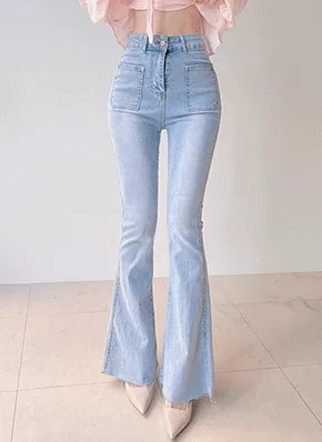 スリムバックフラップポケットフレアデニムパンツ