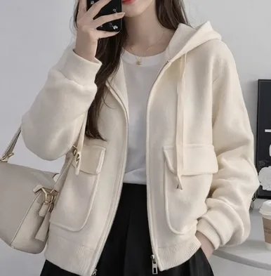 ナイロンジップアップフードドローストリングルーズ長袖フラップポケットアウトポケットボタンスリーブハーフ無地カーディガン