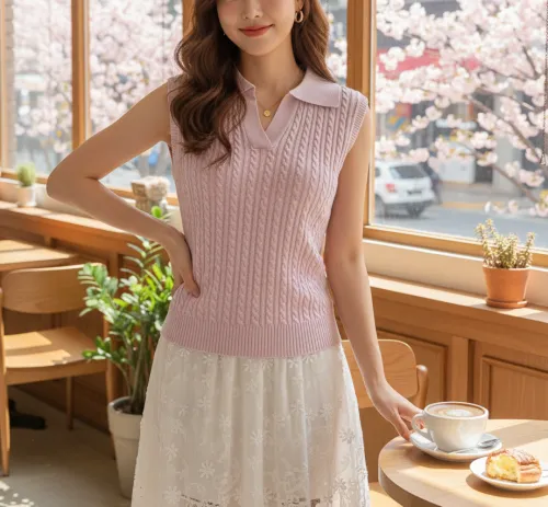 ウール混Vネックオープンカラーベーシックケーブルニットベスト