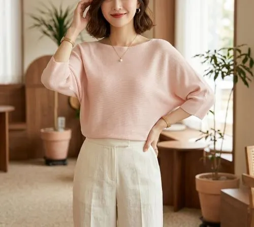 リネン混ボートネックドルマンルーズ7分袖ニット