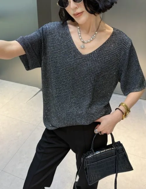 スパンコールVネックルーズ半袖ラインストーンニット