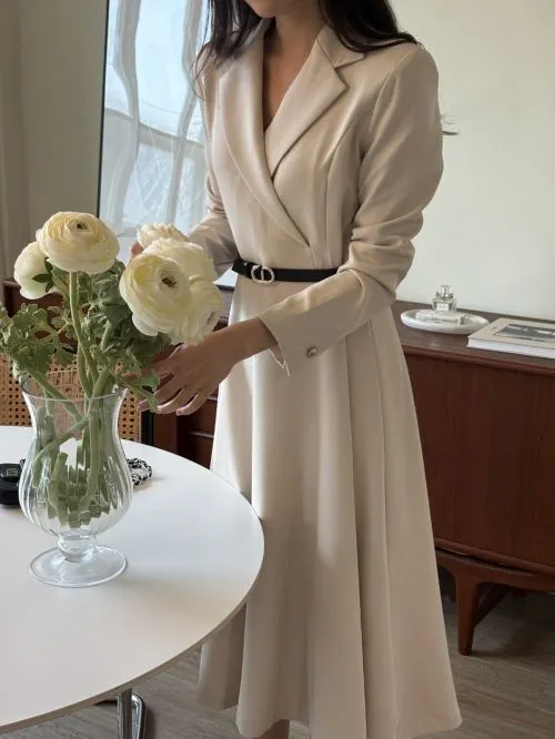 肩パッドオープンカラーラインラップ調ロング長袖フレアAライン無地ワンピースベルト付・B1958850
