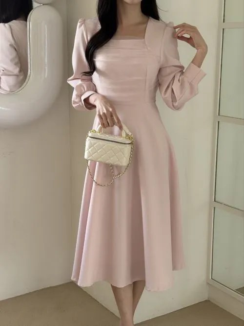 シフォンコンビスクエアネックパフスリーブロング長袖ギャザーフレアAラインボタンスリーブ無地ワンピース・B1958788