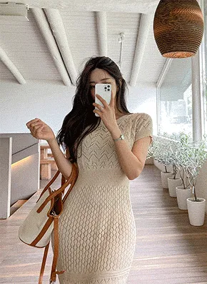 ニットスリムスクエアネックロング半袖ワンピース・S1964983