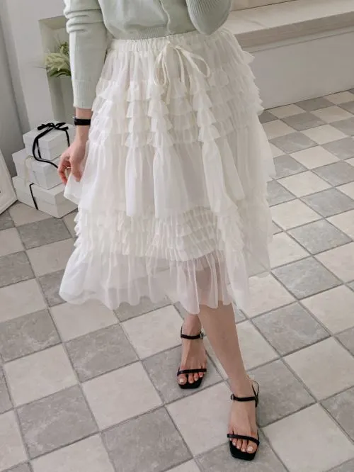ドローストリングフリルティアードウエストゴムミディAライン無地スカート・B1957871