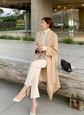 ベルト付ウール混カシミヤ混マキシロング長袖ワンボタンショールカラーコート