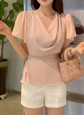 ベルト付ドレープネック半袖ブラウス・p1909374