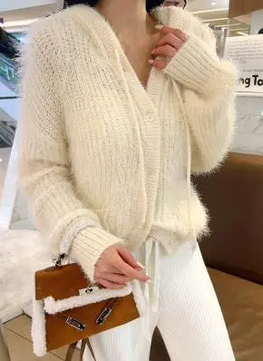ニットソフトアンゴラ混ボタンフードルーズ長袖カーディガン