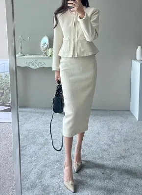 ツイードボタンジップアップラウンドネック長袖ミディセットアップスカートジャケット・S1939209