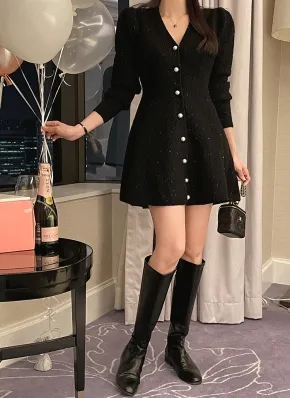 ツイードグリッタースリム長袖ジップアップミニフレアパフスリーブワンピース