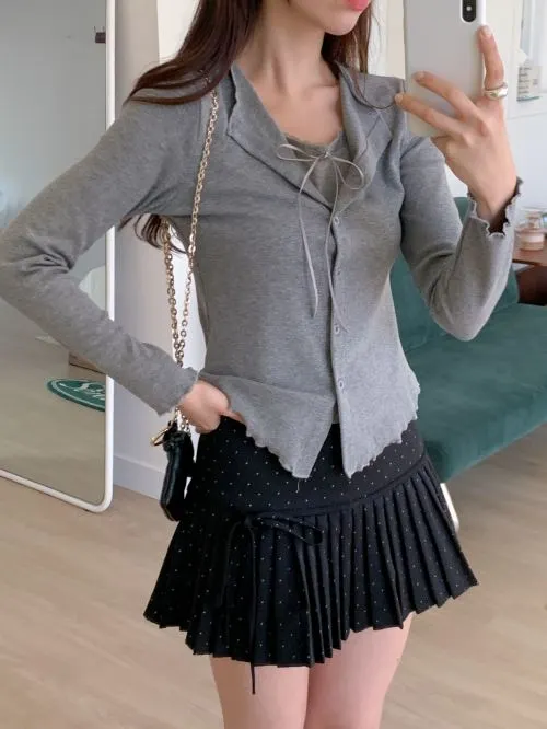 リブレースコンビリボンボタンカラーメロウレイヤード風長袖セミクロップド無地Tシャツ・B1960101