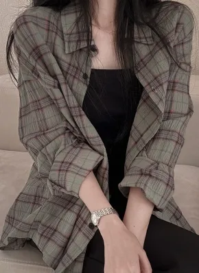 ボクシーカラー長袖ボタンスリーブボタンワイドルーズチェックシャツ・S1956274