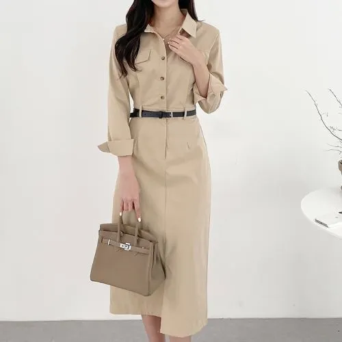7分袖ミディフレアロングシャツワンピースベルト付・S1960617