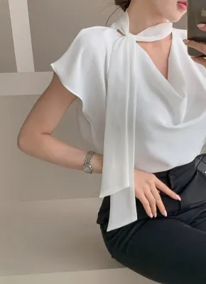 ベルト付ドレープネック半袖ブラウス・p1909374
