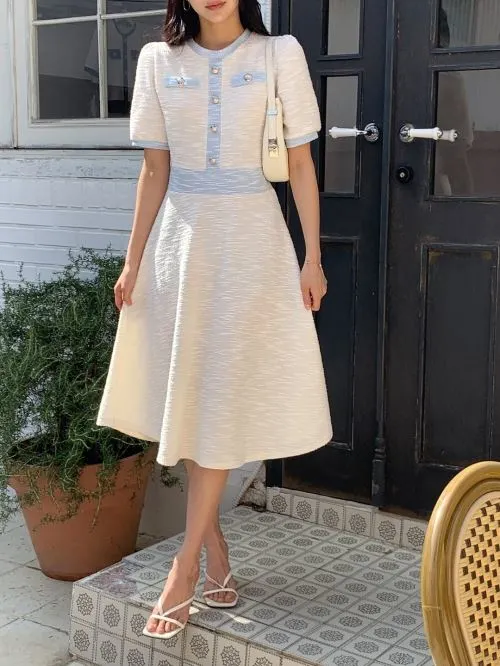 ツイードストレッチラウンドネック長袖Aラインフェイクボタンフェイクポケット配色ワンピース・S1964992