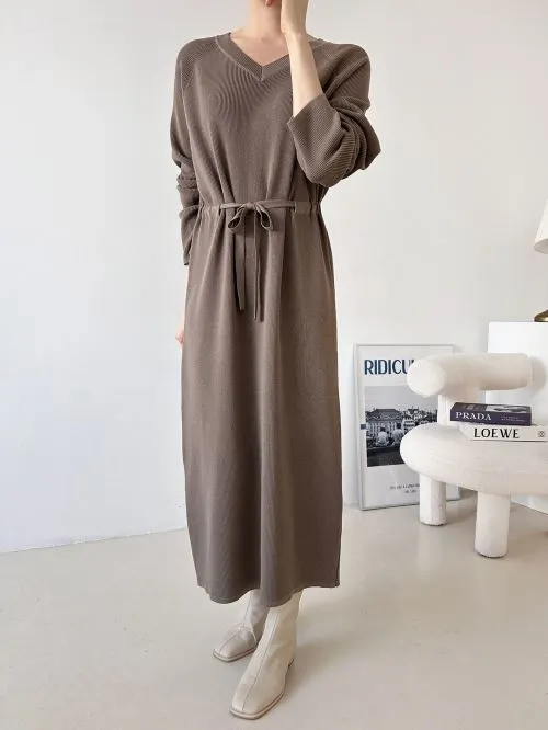 ニットVネックドローストリングロング長袖ワンピース・B1959842